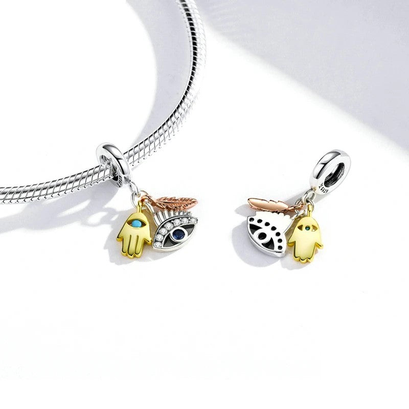 - Triple Dangle Charm Featuring Hand Of Fatima, Eye & Feather,