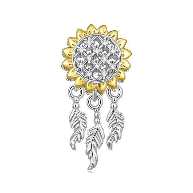 - Figural Sunflower Charm Featuring Dangling Feathers,
